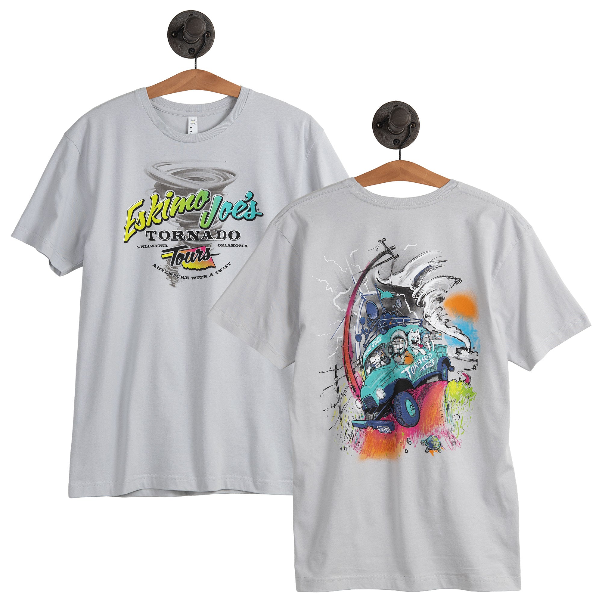Hold onto your hats because this year's Storm Tee has arrived! This silver shirt takes you on a wild ride with a bold, 90s-inspired "Adventure with a Twist" design featuring Joe and Buffy chasing storms in a geared-up truck. Printed on a 100% ringspun cotton tee from LAT Apparel for a super-soft feel that is lightweight and breathable. Perfect for weather watchers and thrill-seekers looking for all-day comfort. Grab yours today and get ready to chase the fun!